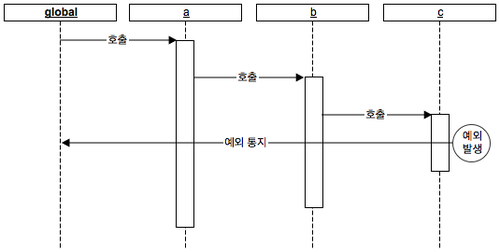 이 동작은 에러를 상위에서 통합해 처리하거나 라이브러리를 이용하는 클라이언트에게 에러 처리를 강제하는 등 편리하게 이용될 수 있습니다. 예외는 함수를 호출한 상위(호출 이력, 콜-스택)로 전파된다는 점을 꼭 기억해 두시길 바랍니다. 앞으로 설명할 내용을 이해하는 데 필요한 개념입니다.