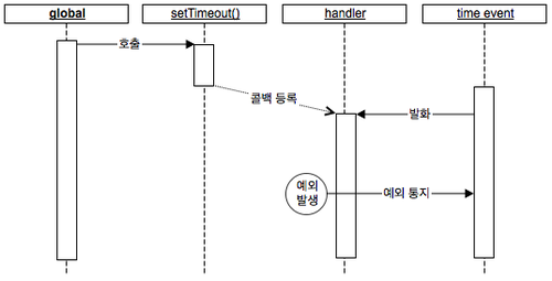 유감스럽게도 이 코드는 동작하지 않습니다. 예외는 감지되지 않으며 컴파일러는 중단됩니다. 이전 절에서 예외는 함수를 호출한 상위(호출 이력, 콜-스택)로 거슬러 전파된다고 설명해 드렸습니다. 콜백 스타일의 비동기 처리에서는 작성한 곳에서 함수가 호출되지 않습니다. 예외를 throw 하는 함수는 이 try-catch 안에서 단순히 정의된 것뿐입니다. 실제로 함수는 타이머 이벤트에 의해서 실행됩니다. try-catch 안에서 발생한 오류가 아니므로 예외를 감지할 수 없습니다.