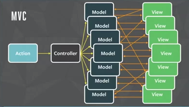 지난 F8의 「Hacker Way: Rethinking Web App Development at Facebook」 세션에서 페이스북의 기술 매니저인 Tom Occhino는 일정 수준 이상의(sufficiently) 코드 베이스와 대규모 개발 조직에 관해 설명하고 거듭 「MVC는 정말 눈 깜짝할 사이에 복잡해진다」 라고 말하며 MVC는 큰 시스템에 어울리지 않는다고 결론지었다. 어떤 새로운 기능을 추가하려고 할 때마다 시스템의 복잡도는 기하급수적(지수, exponential)으로 증가하며 「깨지기 쉽고 예측 불가능한 코드」가 된다, 이것은 거대한 코드 베이스에 참여한 개발자에게 「이미 존재하는 기능에 문제를 발생시킬까 두려워 코드를 수정하지 못하는 새로운 심각한 문제」를 일으킨다고 이어서 말했다. 그 결과 페이스북은 MVC와 결별하게 된 것이다.