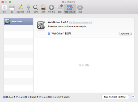 사파리 브라우저에서 테스트하고자 한다면 사파리 웹드라이버를 확장 기능으로 설치해야한다. 자세한 내용은 나이트왓치 위치의 Running tests in Safari 문서를 참고한다.