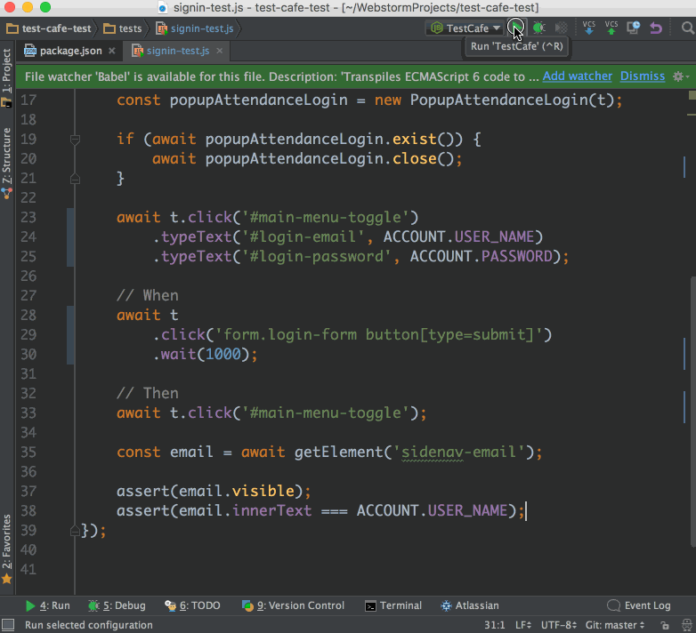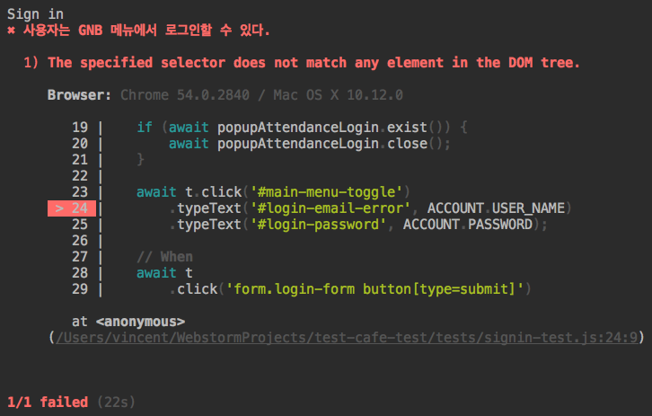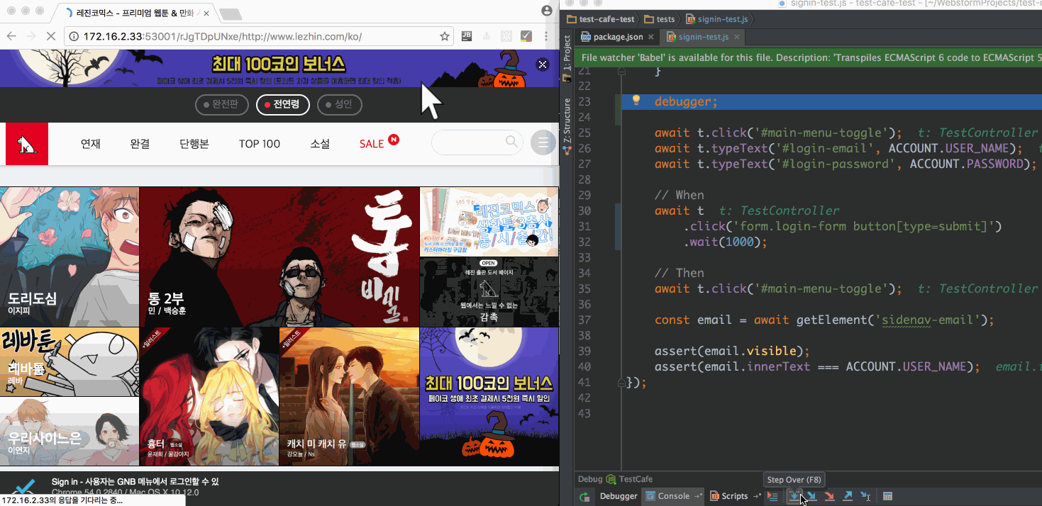 위는 레진에서 GNB 메뉴를 이용해 로그인이 정상적으로 이뤄지는지 테스트하는 코드다. 그리고 이 코드는 await/async를 이용해 비동기적 절차를 동기적으로 표현하고 있다. TestCafe는 바벨(Babel)을 내장하고 있어 별도의 설정 없이 최신 사양을 이용할 수 있다. 최신 사양으로 코드를 작성하고자 할 때 복잡한 세팅을 해줘야 하는 기존의 테스트 프레임워크와는 다른 부분이다.