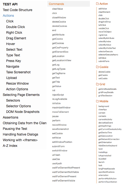 왼쪽 부터 차례대로 TestCafe, 나이트왓치, webdriver.io 가 제공하고 있는 액션 및 API 목록이다. 기본적인 액션은 제공하지만, 모바일에 특화된 액션이나 스크립트 권한 밖의 액션 등은 이용하기 힘들다. 시간이 지나면서 제공될 수 있는 API도 있지만 TestCafe가 가지고 있는 구조적 한계로 인해 아예 불가능한 API도 있다.
