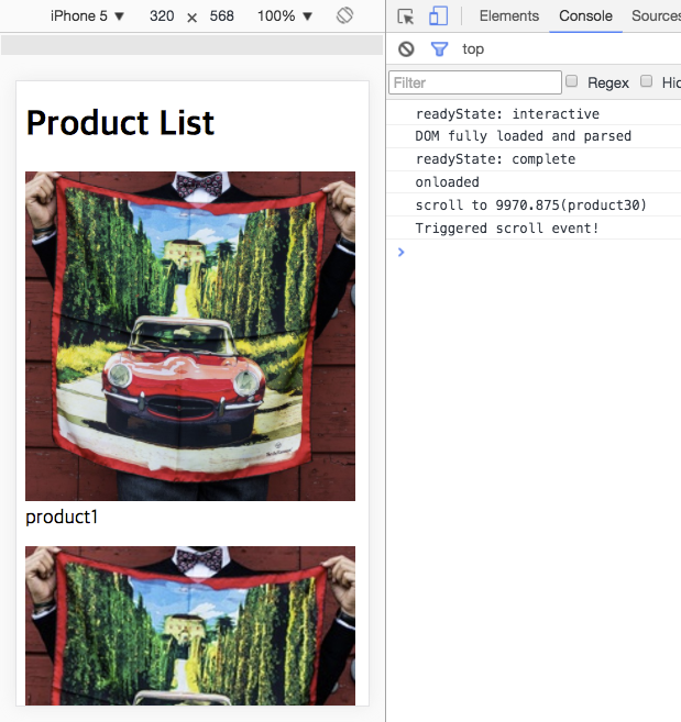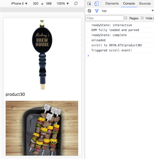 그런데 프로토타이핑하던 도중 예전엔 경험하지 못했던 이상한 현상이 발견됐다. 아래는 사용자가 마지막으로 클릭한 아이템이 “product30” 이라고 보고 해당하는 엘리먼트의 위치로 스크롤링하는 간단한 코드다.