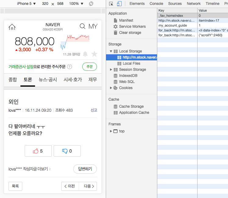 대표적으로 네이버 주식 모바일 웹이 그런 방식으로 구현돼 있는데 토론 목록 페이지에서 토론 페이지로 접근하면 scrollY 값을 기억해 뒀다가, 뒤로 가기 하여 토론 목록 페이지로 되돌아오면 이 값을 이용해 스크롤 위치를 조절한다.
