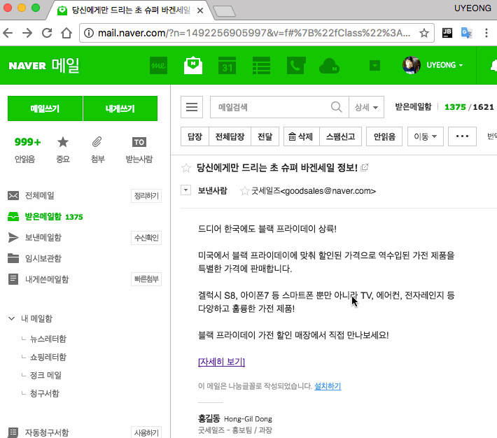 시나리오를 하나 그려보자. 공격자가 네이버 계정을 탈취할 목적으로 여러분에게 바겐세일 정보를 담은 메일을 보냈다. 그 메일에는 [자세히 보기]라는 외부 링크가 포함돼 있다.