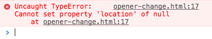 rel=noopener 속성이 부여된 링크를 통해 열린 페이지는 location 변경과 같은 자바스크립트 요청을 거부한다. 정확히 말해서 Uncaught TypeError 에러를 발생시킨다(크롬 기준).