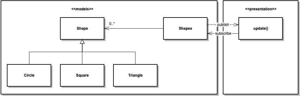 이렇게 작성한 이유는 변경에 대한 통지를 Shapes에서 총괄하기 위해서다. 표현은 Shapes만 구독하면 되기 때문에 단순하게 구현할 수 있다. 이 방법이 낯설지 모르겠지만 필자는 현 예제 규모에 잘 어울린다고 생각했다.