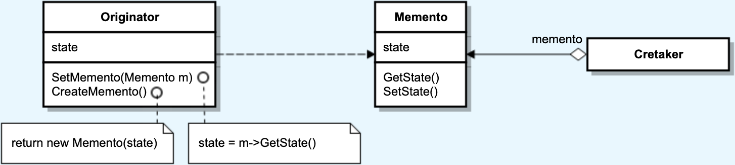 이미 눈치챈 사람도 있겠지만 이것은 메멘토 패턴이다. 메멘토 패턴은 Originator에서 Memento(상태)를 가져와 Cretaker에 저장하고 추후 다시 꺼내 Originator에 전달하여 상태를 되돌리는 패턴을 말한다(참고).