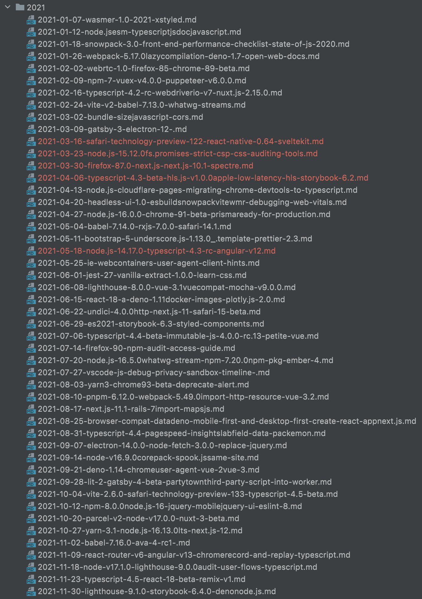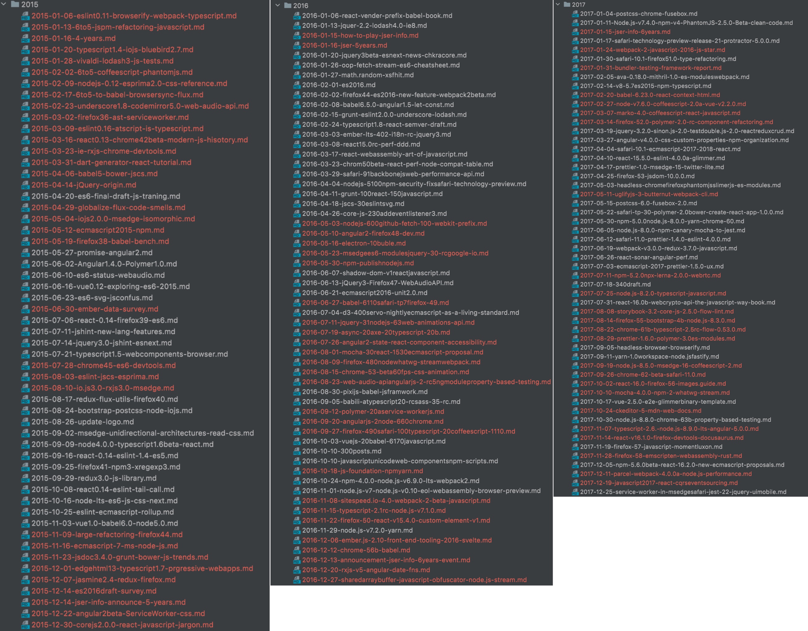 빨간색은 번역하지 않고 건너뛴 것. 하얀색은 번역해서 커밋한 것이다. 2015년에는 55개 중 22개, 2016년에는 58개 중 31개, 2017년에는 54개 중 30개를 번역했다. 번역하지 않은 소식지는 필자 자신도 살펴보지 않았음을 의미한다.