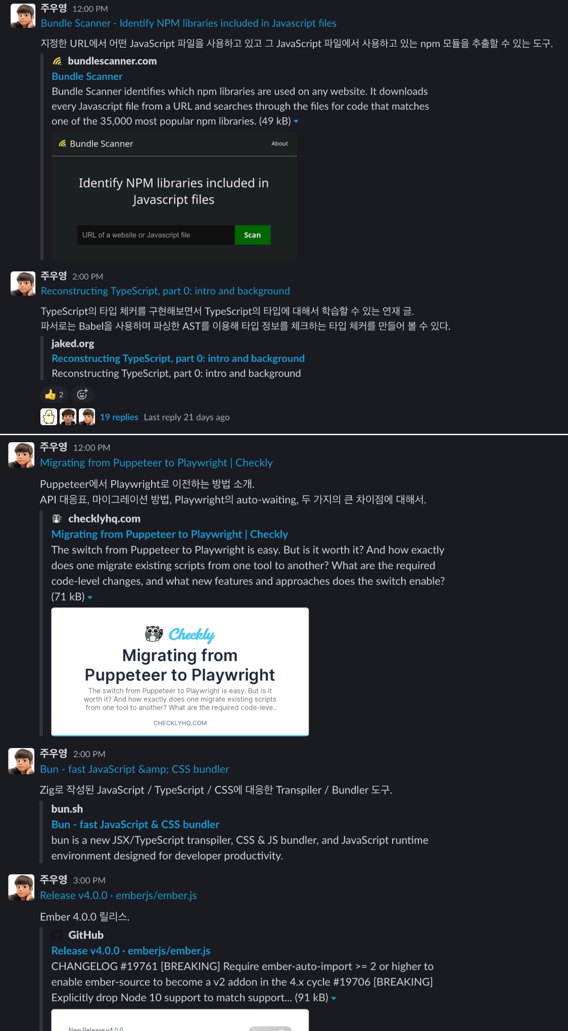 팀 내에서는 Realtime JSer.info를 구독하여 실시간으로 소식을 공유하고 있으며 좋은 동료 덕분에 함께 토론하고 기술 이해도를 높이는데 도움을 받고 있다. 우리와 함께하고 싶은 분은 언제든지 환영! 네이버웹툰의 W FE TECH 팀도 관심있게 봐주길 바란다.