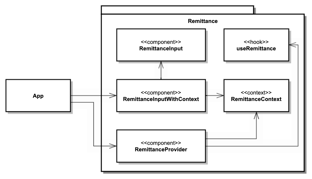 아직 아쉬운 부분이 있는데 논리적인 패키지 단위로 나눴으나 여전히 RemittanceInput과 useRemittance의 관계를 코드 상에서 알기 어렵다는 것이다. 그렇다고 useRemittance를 RemittanceInput 내부로 옮기면 송금액 데이터를 다른 컴포넌트가 참조할 수 없기 때문에 옳지 않다. 문제를 해결하기 위해 컨텍스트를 추가하여 Remittance 패키지를 좀 더 보강해보자.